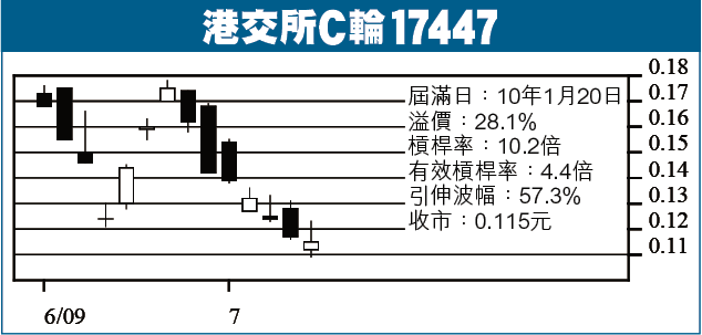 ■港交所C輪17447收0.115元,跌0.002元,成交177球。此輪10年1月20日期滿,行使價138.98元,溢價28.1%,槓桿率10.2倍,有效4.4倍,引伸波幅57.3%。