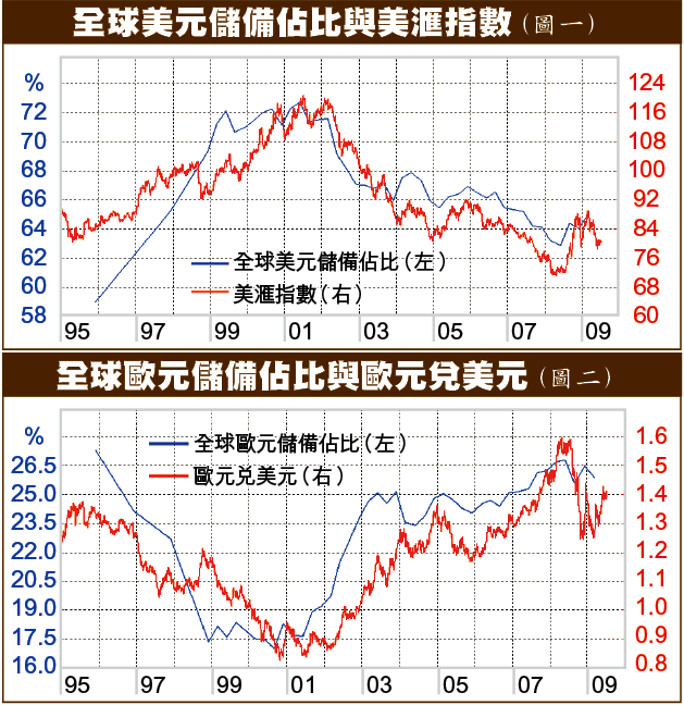 至於全球持有歐洲貨幣的比重,則於90年代中起由兩成七減至歐元面世後最低的一成七。不過,隨後數年卻飆升至兩成半水平,近幾年再添約1%(圖二)。不難發現,隨着儲備比重增減,貨幣滙率相應上落。21世紀以前,儲備比重似有領先滙率之象,但近五、七年來,兩者已幾近同步。由於儲備數字滯後一季才公佈,故兩者同步,若非出於市場先知先覺、反應奇快,便是因為央行改變儲備比重的程度大到主導了滙市上落。
