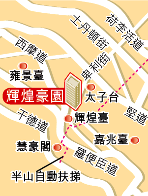 座落西半山西摩道的輝煌豪園,對出既有巴士站,又鄰近半山自動扶梯,周邊更結集各式商舖,包括兩大超市、便利店、個人護理品及餅店等,地點以熱鬧方便見稱。