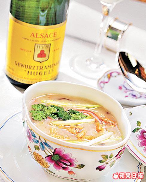 以魚骨蔬菜熬湯底,魚味清甜。配法國白酒Hugel&FilsGewurztraminer2006:帶肉桂和花香味,入口圓潤。
