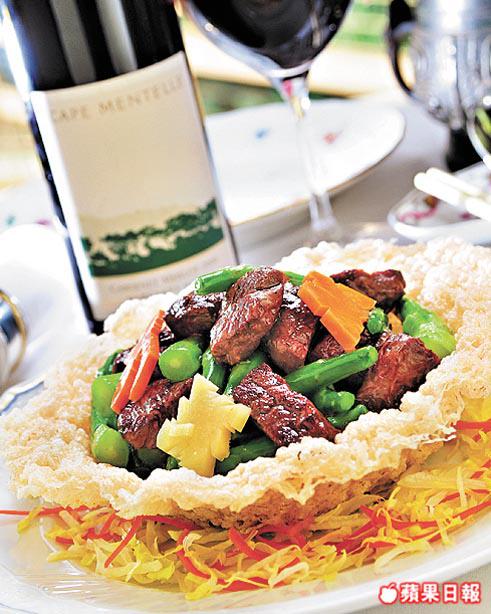 和牛以胡椒、鹽醃,牛味鮮甜,肉質帶嚼勁。配澳洲紅酒CapeMentelleTrindersCabernetMerlot2006:帶呍呢拿和果香,口感柔順。