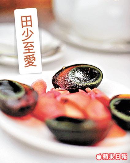 甫入鏞記,田少甚為熟路,與經理打個招呼,即介紹了幾個必食小菜,鏞記招牌皮蛋酸薑遠近馳名,田少亦讚口不絕,「鏞記入到靚皮蛋,蛋白晶瑩剔透,蛋黃則是半凝固的溏心狀。吃時先灑少許糖,加片酸薑,一啖吞到口裏就最正﹗」講到眉飛色舞,田少食時還是先將半個蛋黃挑了出來,「雖然真的很好吃,不過膽固醇高,為了身體,還是不能吃太多。」如此忍得口,難怪身形keep得fit!除了皮蛋,鏞記最近推出的LouisLatour紅酒,配幾道招牌菜,亦甚得田少心,「中菜配紅酒,菜式本身不能太濃味,否則會搶了酒味,好似燒鵝本身點甜酸醬,換上紅酒,味道一樣夾﹗」