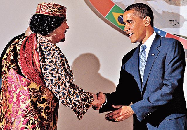 前日較具歷史性的插曲,是利比亞領導人卡達菲以非洲聯盟主席身份出席峯會,合照時與奧巴馬握手(圖),兩人在晚宴更坐在一起,中間只是隔着貝盧斯科尼。這次也是卡達菲第一次見美國總統。美國指利比亞支持恐怖組織,1981年斷交,2004年在利比亞宣佈放棄大殺傷力武器計劃後復交,但直到利比亞去年賠償給1980年代兩宗恐襲受害者,才除去兩國關係一大根刺。