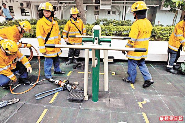 男童雖然在打機,卻一邊玩一邊哭叫:「好痛呀!好痛呀!」消防員用紅氈擋着男童視線,用十多分鐘將腳踏鋸斷救出男童,他右小腿內側紅腫一片。稍後,街坊聯絡到男童家人趕來,陪同他送院治理,管理員則將現場圍上膠帶,設施暫停使用。