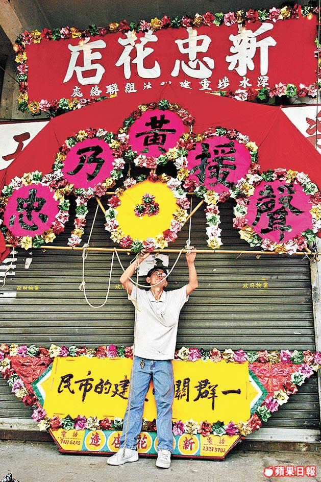 親手綁好花牌後,51歲的黃乃忠說出告別老舖的心聲。從九龍城寨搬到元州邨,再遷入福榮街,經歷多次重建遷徙的他慨嘆「再走唔郁」。他說,生意、信用,要在固定地方慢慢累積,更何況多年來,一直找不到另一個適合經營傳統花牌紮作生意的舖位。