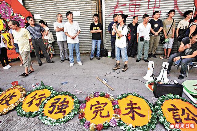 【本報訊】深水埗K20-23項目最後的重建戶、福榮街新忠花店老闆黃乃忠,昨晨將寫上「為公義而上訴」的花牌掛在花店閘門,然後與支持者坐在店外的行人路旁,靜候執達主任破門入屋。群眾在舊樓前門抗議政府強行遷拆、趕絕小市民,房協職員卻悄悄從後門入屋收樓,並派保安員用背脊遮擋公眾視線。關心重建的市民忍不住直斥:「房協背對人,收樓鬼祟到暈。」