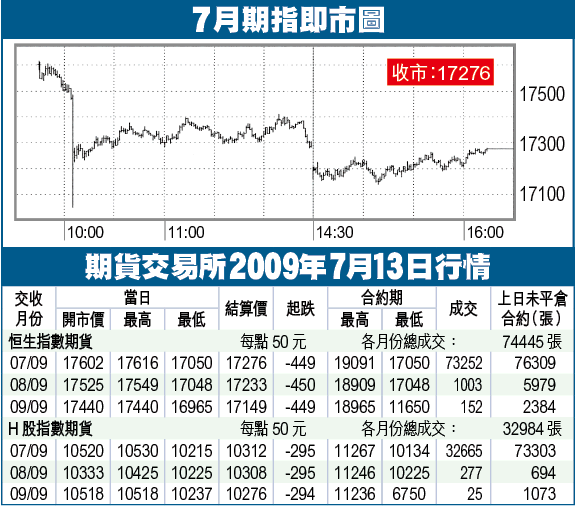 期指昨日未能穩守17500,穿位後呈單邊下滑,連6月份圖表低位亦失守,跌至17050始見反彈,以17276低收,急挫449點,高水22點。