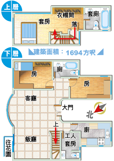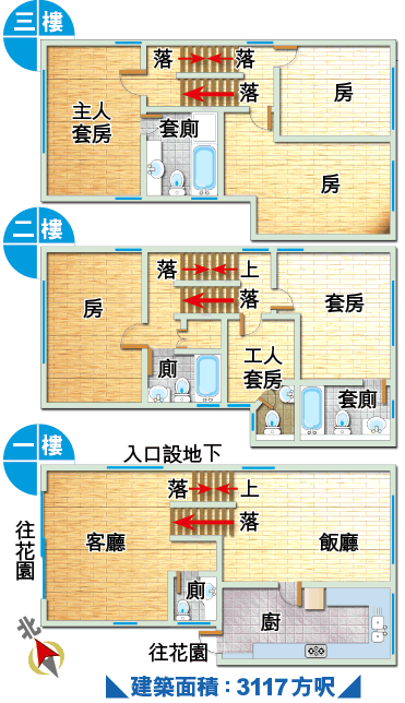 間隔:3房(1套連衣帽間)2廳;另工人套房