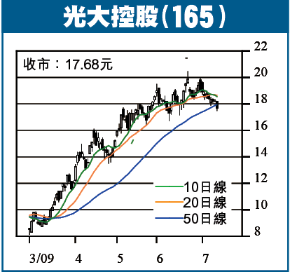 跌市有時唔可怕,因可趁機低吸心水愛股。光大控股(165)上月升至20.45元後隨大市調整。昨跌逾3%,收報17.68元,失守50日線17.90元,走勢明顯轉弱,唔排除後市跌勢進一步加快,如果16元守唔住,或要回補5月初介乎15.28元至15.52元之上升裂口,估計股價跌近15元水平會有較大支持,暫時戒急用忍,等待買入良機。