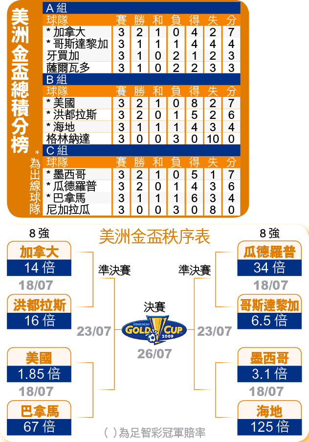 美洲金盃8強已誕生,兩大熱門美國及墨西哥分別在上線及下線一枝獨秀(見附表),尤其是1.85倍大熱的美國,8強只面對巴拿馬,準決賽面對加拿大或洪都拉斯勝方,相信可望穩入決賽。至於墨西哥8強面對海地亦可望輕鬆晉級,但準決賽對手瓜德羅普或哥斯達黎加,料對墨軍有較大阻力。