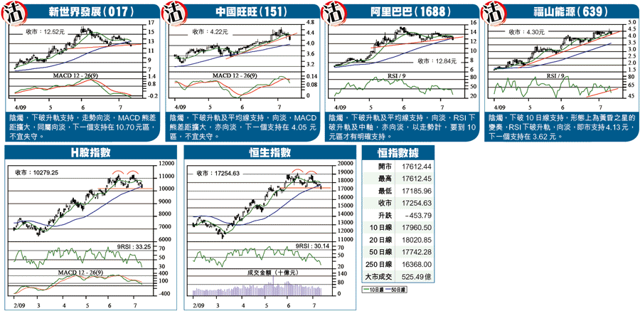 日線圖呈大陰燭,在連續幾日呈現待變的形態後出現急挫,並下破雙頂頸線17375支持,顯示大市在鞏固之後,將要進一步下試低位支持,或者說,投資者對即將公佈業績企業的盈利前景信心不足。如是,在這一期業績公佈期中,除非可出現亮點,不然大市沽壓甚難消除。形態上,雙頂走勢經已成形,昨日下破頸線支持,雖然成交略嫌不足,但弱勢已成,只要技術上確認下破,以雙頂走勢的最小量度跌幅計,恒指將下試16000重要支持區。