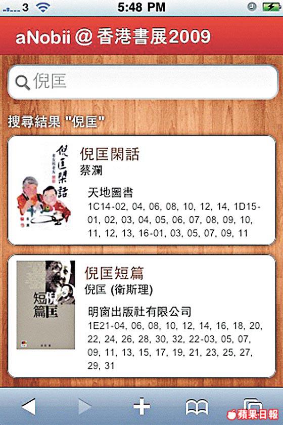 從前在書展要找書,找出版社,惟有摷場刊,科技進步,今年anobii搭上iPhone,只要用iPhone下載有關程式,就可以隨時上網查看你要的書本在那個攤位有售,仲有書評㖭!幾時都話,蘋果電腦係寂寞人士恩物。下載網址: http://www.anobii.com。