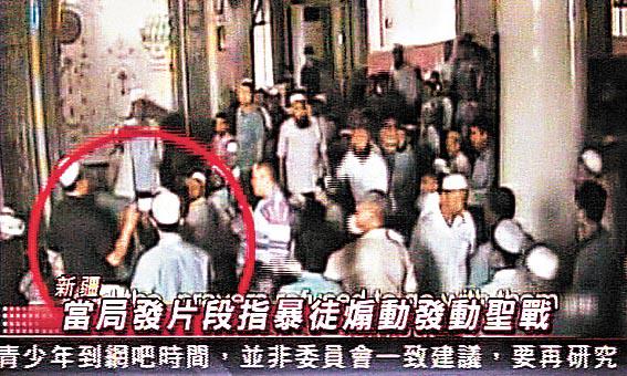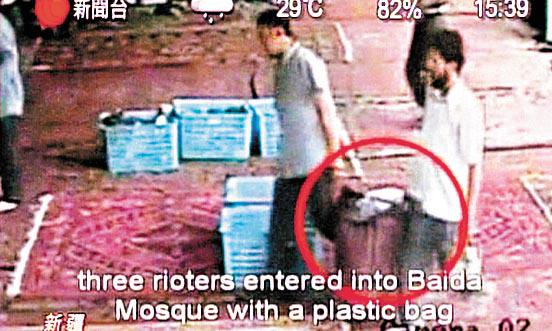 新疆自治區政府昨又公佈閉路電視片段,回應上周一(13日)有三名維族人闖入白大寺,煽動寺內回教教民發動聖戰事件。片段顯示三名維族男子手持裝了共20把大刀的大袋入寺,試圖將刀分發給做禮拜的教民,煽動他們發動聖戰,但被拒絕,許多教民轉身離開;這時,三名維族男子拿起大刀,追斬教民。其後三名煽動者在街上遭遇趕來的軍警,雙方追逐間,聽到10多響槍聲,其中手持長刀逃跑的穿白衣維族人被擊斃,另一名穿深色衣服的維族人,最少身中三槍,中槍後一度站起身,最後仍倒地,傷重不治,另一名維族人則受槍傷送院。新疆維吾爾自治區主席努爾.白克力接受境外傳媒採訪時強調,軍警是看到三名男子持刀追着信眾才出手阻止。
