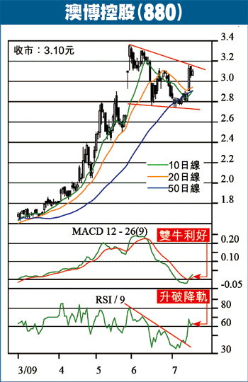 (6)技術走勢向好,澳博5月尾升上3.35元後整固,上周升勢再起,暫受制於降軌造旗,惟MACD發出雙牛訊號,料可順利破關。