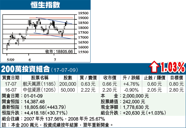 兩大指數若能破頂,恒指可望上試21000水平,而H指則上望12400水平,屆時本組合會採取較進取的策略。當然,樂觀之餘仍要保持戒心,今日尾市時若見利淡形態,例如裂口高開後卻以大陰燭低收,構成穿頭破腳,就要清貨或減磅,本組合內的股份,屆時即使未到止蝕位,亦會作同樣處理。