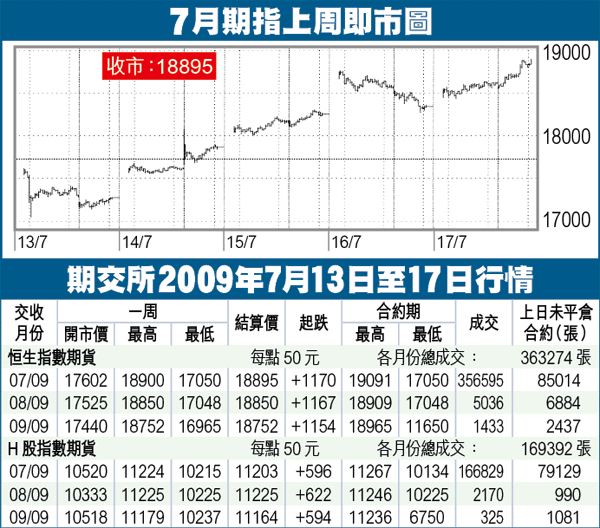 期指上周一跌破6月份低位,低見17050後高速轉向,連升4日,有破頂之勢,以18895高收,全周勁升1170點,高水90點。