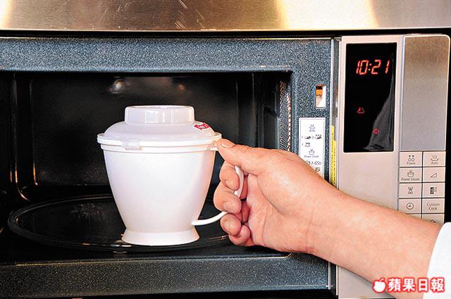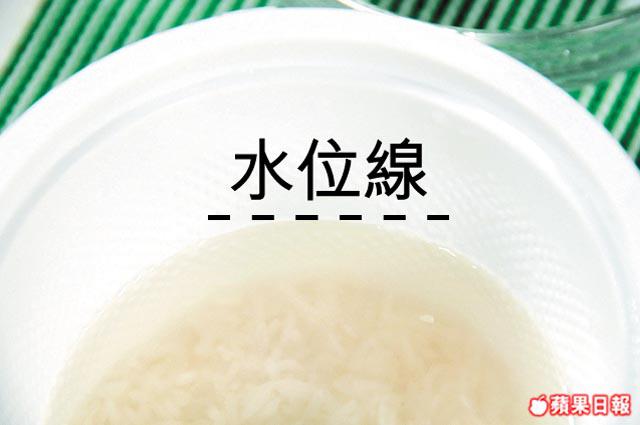 1.將米放入叮飯杯,加水至指示的位置,冚上蓋,放入微波爐叮10分鐘。