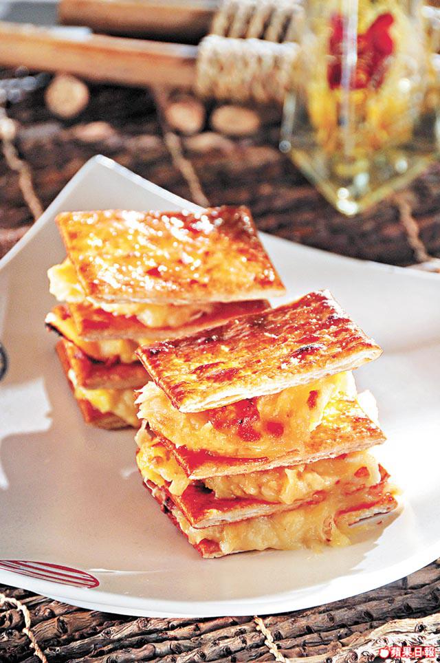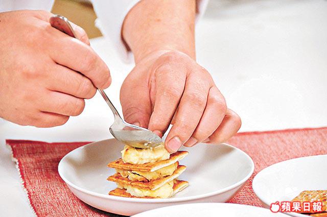 2.取出榴槤鋪於麥芽餅上,如此類推叠成4層高即可。