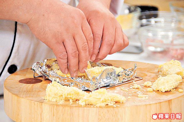 1.將榴槤切片起核,將榴槤肉兩面蘸上芝士碎後壓實,放入焗爐焗約15分鐘至焦香。