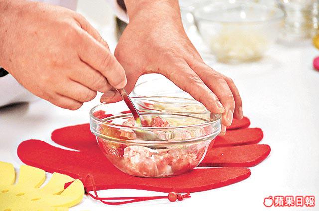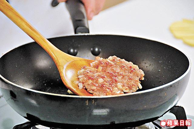 拌肉碎時,要慢慢加水,因為一次過加太多水,肉碎不能充份吸收,之後會攪到水汪汪。