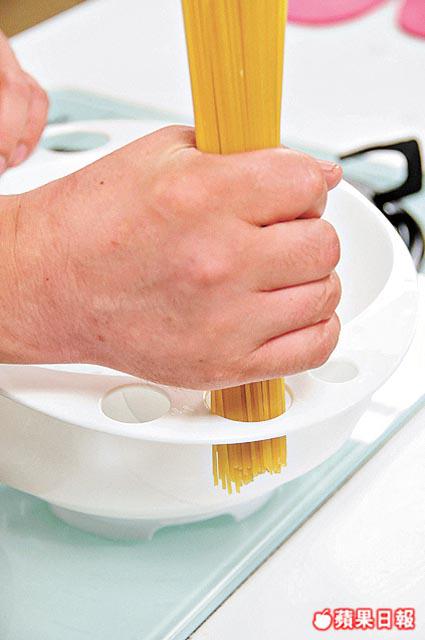 將通粉倒入筲箕,可量出以杯為單位的份量,柄上的圓圈則用來量意粉,有齊1人至4人的份量任你揀,唔怕煮多咗食唔晒。