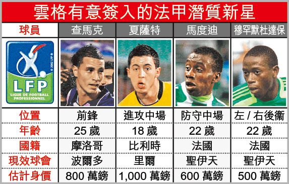 現時雲格亦有意向多位法甲兵埋手,務求「低買高賣」,不過各大球會對法甲新星亦到實,如果雲格希望以數百萬鎊簽得好球員,已非易事。