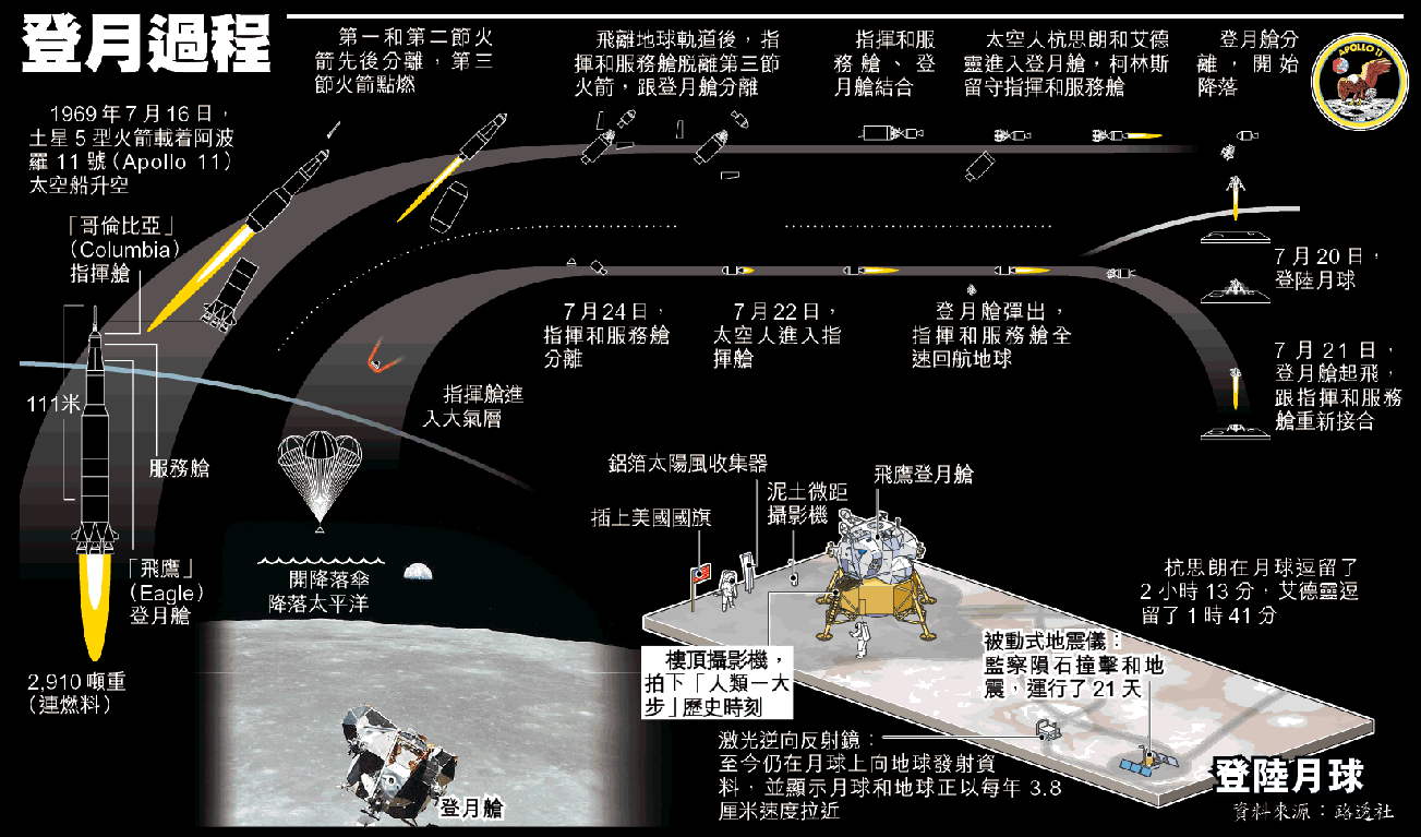 1960年代,美蘇兩個超強國在太空競賽。蘇聯1961年派出全球首位太空人乘坐太空船成功圍繞地球一周,美國為爭奪太空領導地位,展開「阿波羅」登月計劃。1969年7月20日,太空船「阿波羅11號」(Apollo11)接載三名太空人杭思朗、艾德靈(BuzzAldrin)及柯林斯(MichaelCollins)上太空,完成登月創舉。