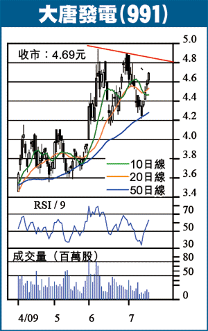 大唐發電(991)上周五報收4.69元,升2.4%,股價於6月初攻破250日線後曾逼向5元關,但無功而還,回試20日線後再組織攻勢,6月底再試5元關亦受阻回落。