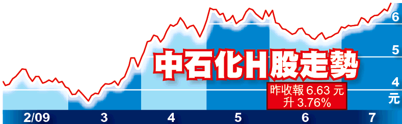 資源股連日擔當中港股市上升的龍頭,惟相對煤炭、鋼鐵及有色金屬股,石化股走勢明顯落後,故成品油價上調傳言一出,石化板塊旋即借勢炒上,當中煉油業務比重較大的中石化最受追捧,其A股9個月來首次升停板,H股亦漲3.76%;旗下上石化H股表現更標青,升7.67%,A股則升4.96%。