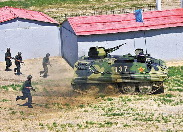 中國和俄羅斯的「和平使命—2009」聯合反恐軍事演習,昨日在俄羅斯的哈巴羅夫斯克市和中國的瀋陽軍區洮南合同戰術訓練基地正式展開為期五天的演習,雙方各1,300人參加實兵演練。前日,俄方部隊在瀋陽軍區洮南合同戰術訓練基地進行實兵分練,中方部份參演部隊予以配合。在約80分鐘的演練中,進行了聯合封控、立體突破、機動殲敵和縱深圍剿等。其中有俄方特種兵乘直升機進行空降(圖一),而中方也配合俄部隊進行了反恐演練(圖二)。新華社