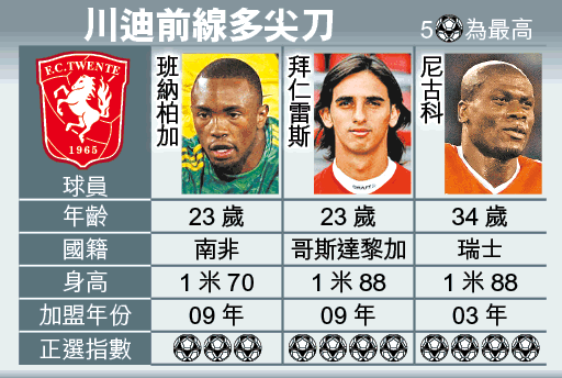 簡評:有機會殺入歐聯分組賽的川迪,季前雖放走射手艾利亞到漢堡,但陣中炮手如雲。班納柏加在今屆洲際國家盃已嶄露頭角,替南非射入2球;另一新兵拜仁雷斯,聯賽首戰2:0勝鹿特丹斯巴達,此子即有入球顯身價。34歲老將尼古科經驗技術搭夠,聯賽開鑼戰即有「士哥」,至今已為川迪入逾百球。文:畢傑