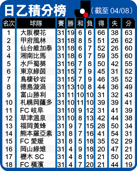 櫻花被視為今季日乙的升班熱門,他們亦沒有令人失望,開「咧」至今於31場取得19勝6和6負居榜首,並且以66球成為入球最多的球隊,火力拍得住上季日乙冠軍廣島三箭。