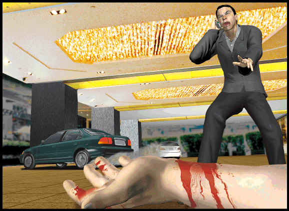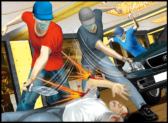 同一時間,另一輛私家車在反方向駛至,車上跳下三名戴着鴨舌帽和口罩的大漢,手持開山刀向倒地的泰龍狂斬,刀刀斬向他的雙臂和胸膛,但其中一刀斬中右脇大動脈,當場鮮血狂噴,血流滿地,殺手事後立即登車迅速逃離現場,酒店職員見狀慌忙報警。救護員到場替重傷的泰龍包紮送院,當時他已全身癱軟,沒有反應。