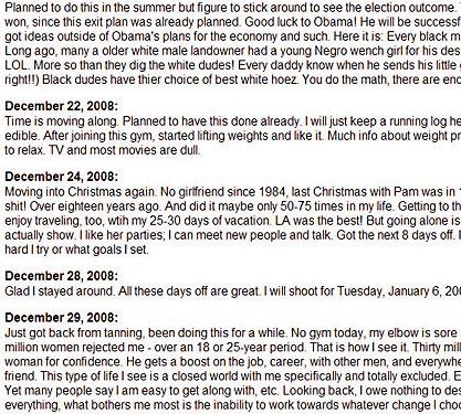 索迪尼在殺人日記一開首,自我介紹,更預告了自己的死亡日期,即他在洛杉磯健身中心做屠夫的一天。他表明寫下殺人日記,是要自白開殺戒的心路歷程。第一篇日記寫於去年11月5日,當時美國總統大選進行得如火如荼,他「祝奧巴馬好運」,指黑人奴隸制度改變了,但不是因為奧巴馬當選,而是「黑人將有更多白人女友」。