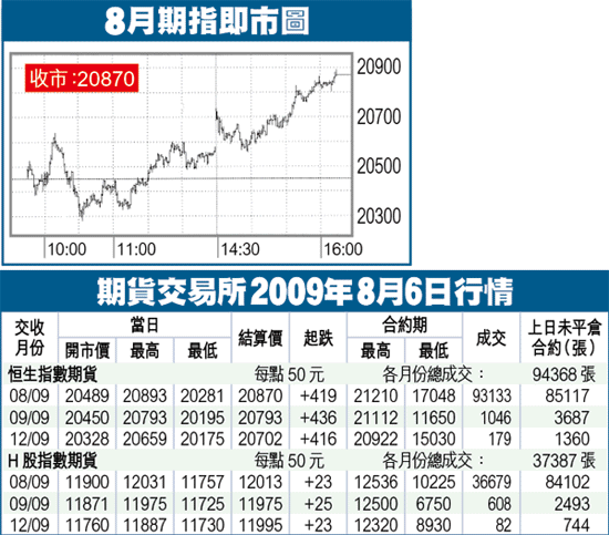 期指初段向下回補上周五裂口後,於20281轉向回升,午市更單邊挾高,扭轉調整格局,以20870高收,急漲419點,低水29點。