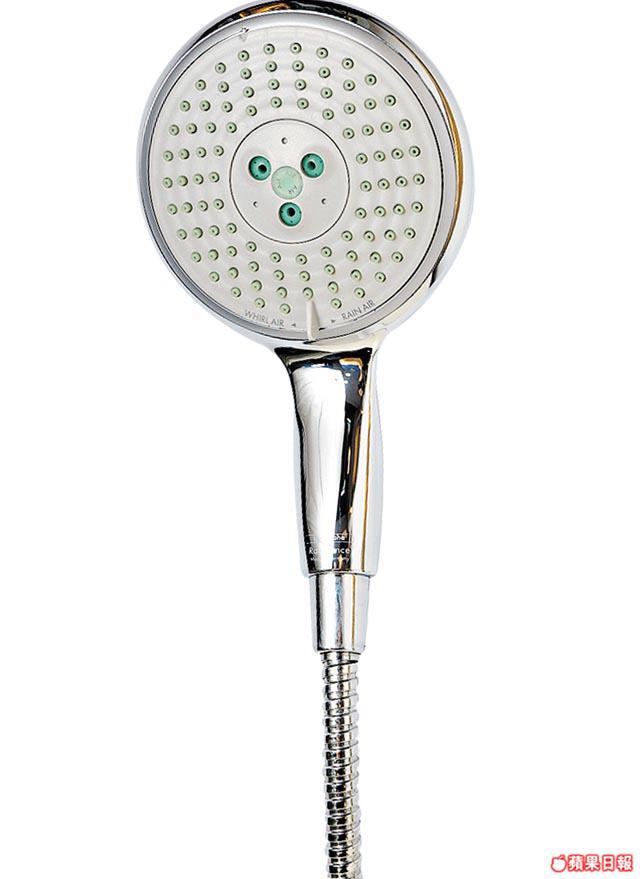 HansgroheRaindance花灑頭,中間三個小點為入氣位,噴出的水會特別強,還附有按摩及慳水功能。