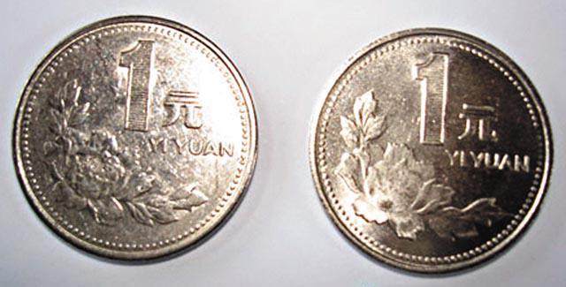看:真硬幣的國徽和背面的「1」字是正對的,假硬幣則多是歪的