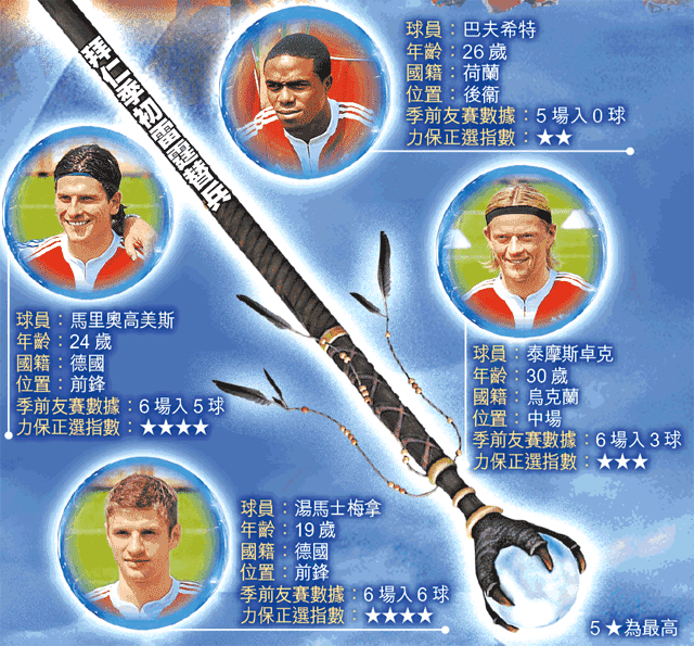 拜仁季初出現輕微缺兵情況,射手東尼與守將迪米捷利斯將要養傷一陣子;不過,教練雲高爾擁有大量替補球員,只要手上魔法棒一揮,眾將便可發揮功效。以下4人,於季前友賽與盃賽均表現出足夠實力。