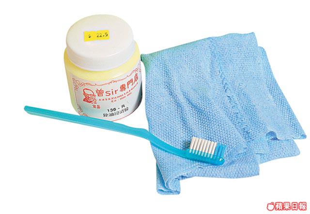 工具:乾布、牙刷及除油浸迹粉