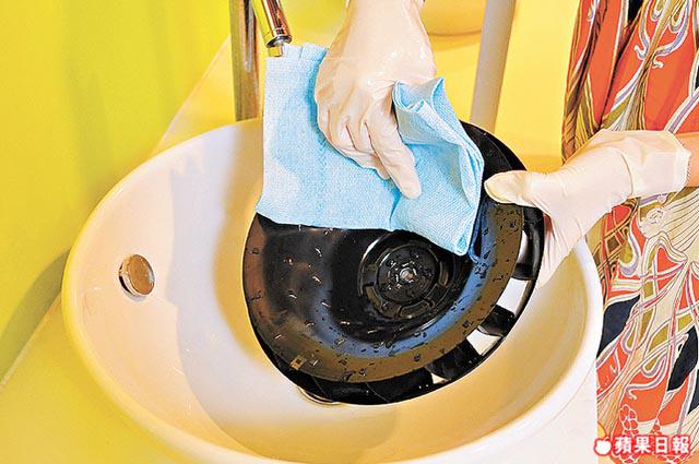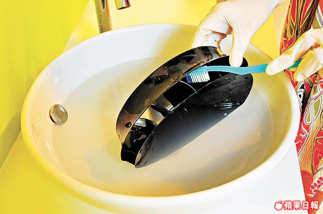 將一杯蓋份量的除油浸迹粉倒入熱水並放進扇葉,用牙刷刷扇葉虛位,然後浸10-15分鐘。
