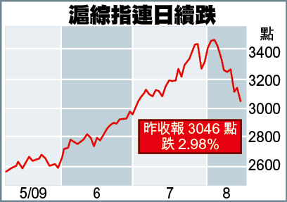 滬綜指跌2.98%,收3046點7周低位,令今年來升幅縮窄至67%;深成指收12499點,跌2.37%,全周跌3.66%,兩市成交升6.7%至2211億元人民幣。受招行融資困擾,銀行股全跌,中信行(998)A股跌4.8%,工行(1398)、交行(3328)及中行(3988)A股滑落逾3%。