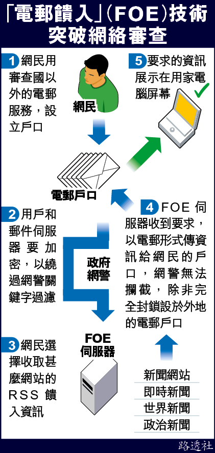 新技術叫「電郵饋入」(feedoveremail,簡稱FOE),是透過Google、微軟和雅虎等外地公司的電郵戶口,接收外國網站饋入的資料,如新聞、網上廣播檔案(podcast)和其他資訊。參與開發的何修(譯音,ShoHo)表示,系統只需稍微調整,手機亦可使用。