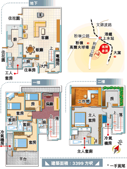 間隔:5房(3套)3廳;另衣帽間、工作間、工人套房及冷氣機房