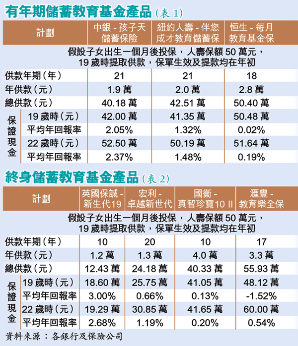 中銀、紐約人壽及恒生提供有年期儲蓄保障計劃,即有關計劃至投保人滿19歲時,可全部或部份提取,或最遲在22歲前提取。恒生供款期最短,供款18年,總供款50.4萬元。不過比較受保人在19或22歲可得保證現金價值,平均年回報率以中銀最吸引,達2%以上(表1)。