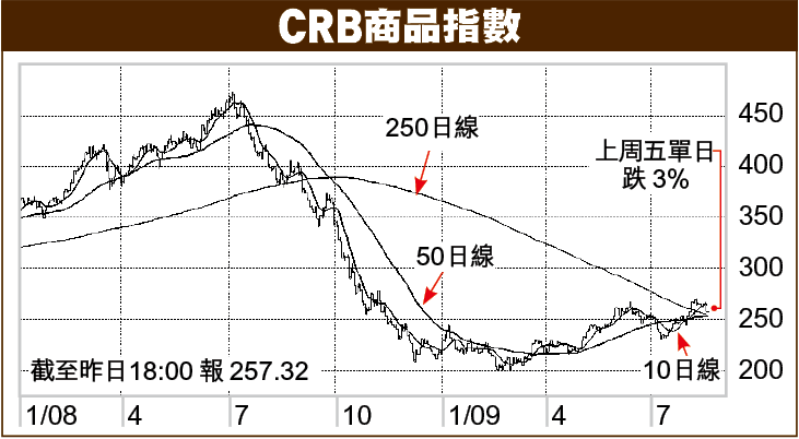 內地對原材料入口囤積過多,尤以鋼材為甚,中國工信部更呼籲鋼鐵業停止擴張3年之久,顯見上半年的盲目擴張,不管是否年頭指定的十大產業,為免日後泡沫過大,也必須加以壓抑。上周五,CRB商品指數也出現這個升浪以來最大的單日跌幅,高達3%。