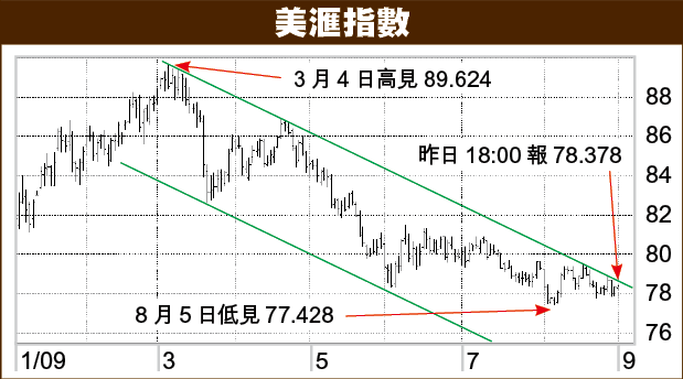 美滙指數在基本面持續惡化下,包括預算赤字擴大、國債拍賣曾經出現不理想情況,但自上月初低見77.428,其後基本上未受考驗,更曾嘗試挑戰從3月初開始連成的下降軌阻力位79.50關口。雖然此阻力暫時要攻破並不容易,但這個下降軌阻力位於本周五,會逐漸下滑至78.30水平,那樣子只要美元兌歐元、日圓及英鎊保持平穩,這個半年的美滙下跌趨勢,便會不攻自破。