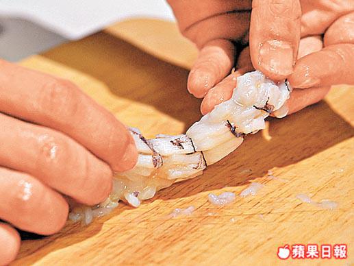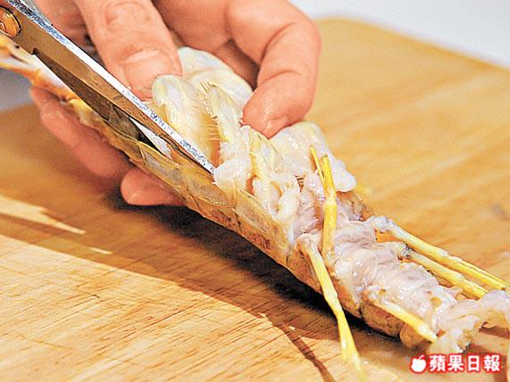 4.將瀨尿蝦用滾水烚15秒後撈起,即時放入冰水冷凍,用鉸剪在蝦側剪開,去殼起肉。