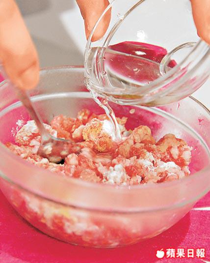 1.豬肉碎用鹽、生粉、雞粉及清水攪拌至略起膠,醃片刻。