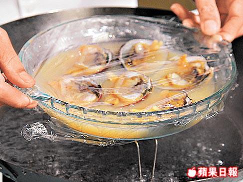 3.燒滾一鑊水,將蛋漿倒入淺缽,放入烚過大蜆,再放入蒸籠,用大火煲滾水後,隔水蒸兩分半鐘後熄火,但不要開蓋,等15分鐘後才開蓋將蛋取出,淋上蒸魚豉油,再撒葱花便完成。