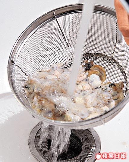 2.揀走蠔仔夾雜的碎殼,加入生粉略省後用清水冲淨,瀝乾水。